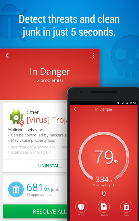 Scan pre-installed and installed apps and the file system to keep your phone safe from virus, trojan, vulnerability, adware, malware and spyware.